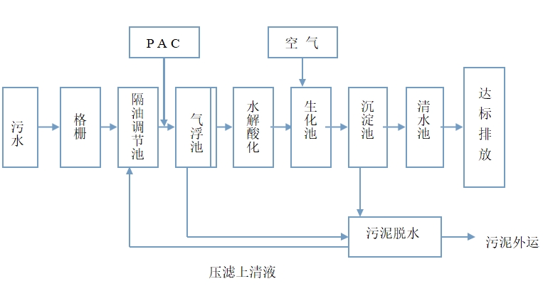 經過技術部討論分析,結合我公司多年來對污水處理的經驗,本方案擬采用格柵+隔油調節池+氣浮+ 水解酸化+生物一體化工藝,該工藝具有技術成熟、效果穩定、污染物去除徹底、操作方便、運行靈活等優點。具體工藝流程如下: