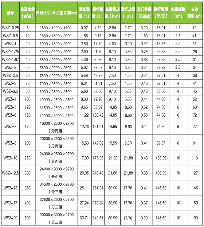 2、下表是WSZ型一體化污水處理設(shè)備型號(hào)表格,從本表格中可以明確的看出那個(gè)型號(hào)的設(shè)備對(duì)應(yīng)的處理水量是多少?客戶可以有目的的選擇設(shè)備型號(hào);
