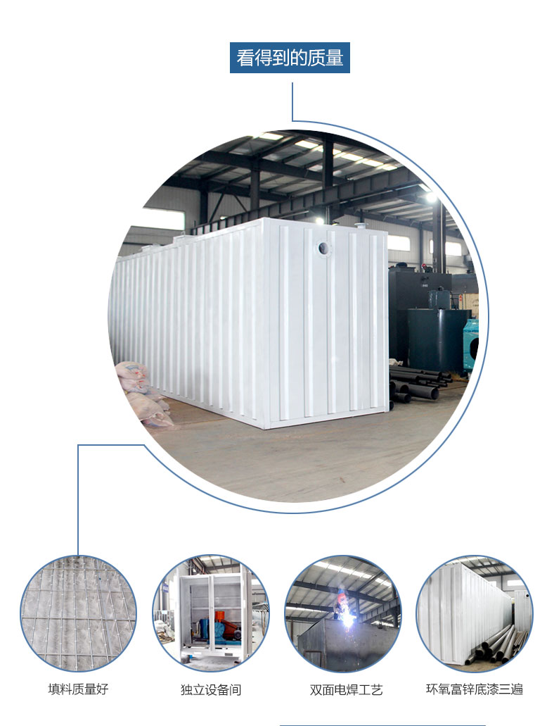 集裝箱一體化污水處理設備是我公司2018年上半年新出的一款時尚、大氣、處理能力強的專門針對于生活污水類似的污水處理設備、設備處理能力為每天污水量5-5000噸、設備主要應用于中小型企事業(yè)單位污水,適用于生活、醫(yī)療、食品工業(yè)、肉類加工、養(yǎng)殖、洗滌、制革等生活和工業(yè)廢水的處理。經我公司集裝箱一體化污水處理設備處理后的水質達到中水回用標準或污水綜合排放標準。