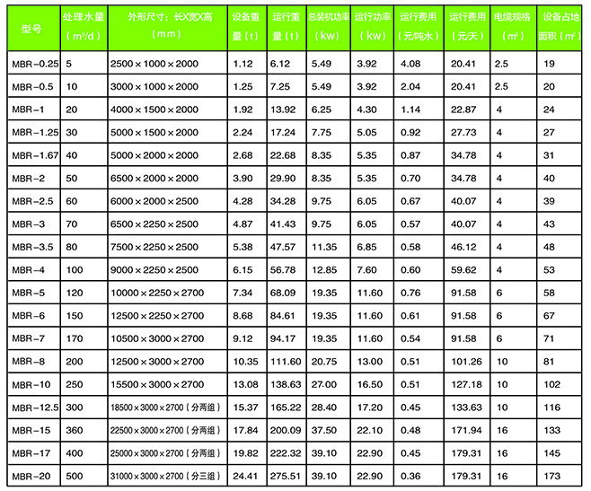 1、下表是根據mbr工藝做的一體化污水處理設備型號的設置,本表格中包含著設備型號,處理水量,設備的外型尺寸,設備重量,運行重量,總裝機濾,運行功率,運行費用,占地面積等的具體描述。